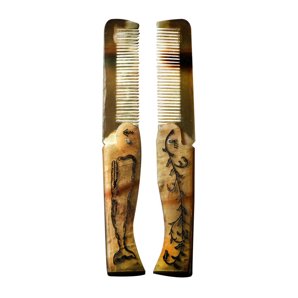 Our Folding double sided Ox Horn comb with scrimshaw style engraving. On one side, classic whale illustration on the other, a laurel with 1776 at the top of the hilt. Comes inside our military canvas bag.